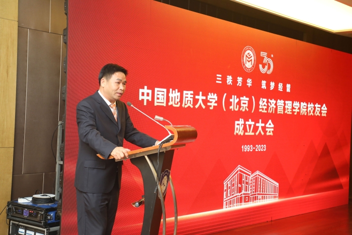 中国地质大学(北京)校务委员会副主任、北京中国地质大学校友会常务副会长王果胜代表学校在会上发表讲话,他对经管学院校友会的成立表示祝贺,对广大校友表达了母校的诚挚问候,对参与筹备工作的校友和工作人员表示衷心感谢。王果胜强调,在母校七十一周年校庆、经管学院建院三十周年之际,学院校友会的正式成立是给母校、学院的一份生日贺礼,也为大家搭建了一个增进友谊、加强交流、反哺母校、回报社会的良好平台。并希望经管校友会坚持守正创新,打造校友工作的新平台,汇聚奋进合力,构建携手共进的新格局,弘扬地大精神,对接社会发展的新需求。最后,他表示,母校永远是大家的港湾,欢迎各位校友常回家看看!