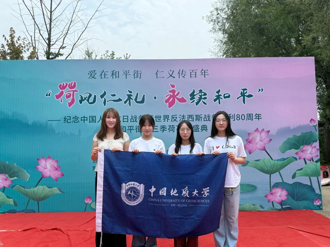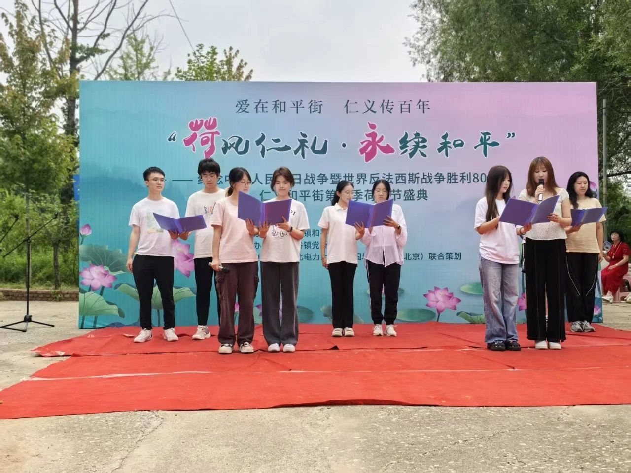 实践团队将垤子峪荷花节作为核心平台,全程深度参与策划并协助组织了以“荷风仁礼 永续和平——纪念中国人民抗日战争暨世界反法西斯战争胜利80周年”为主题的仁义和平街第三季荷花节,有效促进了和平街村文化价值挖掘与经济效益提升的双丰收。