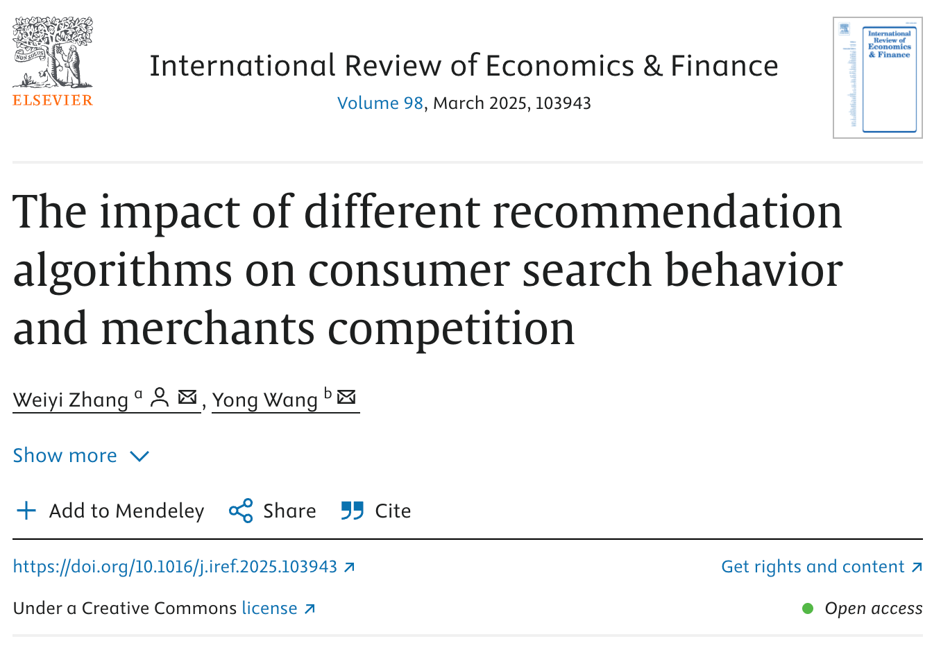 Zhang, W., & Wang, Y. (2025). The impact of different recommendation algorithms on consumer search behavior and merchants competition. International Review of Economics & Finance, 98, 103943[SSCI Q2, IF=5.6]ABS二星.