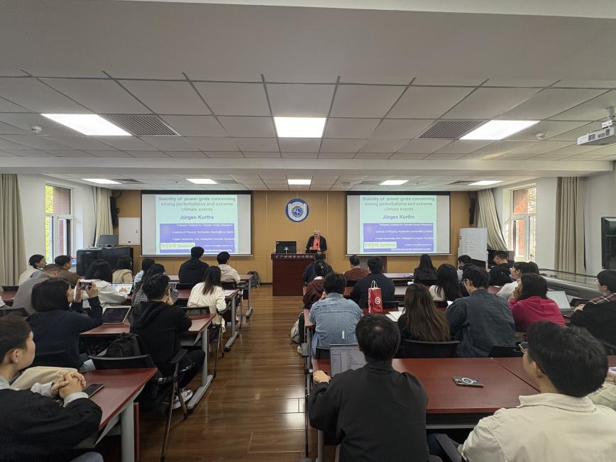 10月14日,应我院副院长高湘昀教授的邀请,德国波茨坦气候影响研究所、柏林洪堡大学,欧洲科学院院士Jürgen Kurths教授在教四楼219报告厅做了题为《Stability of complex systems under large perturbations and extreme climate events》的学术报告。 我校多位老师以及50余名硕士、博士研究生参加了此次报告会,现场学术氛围热烈。