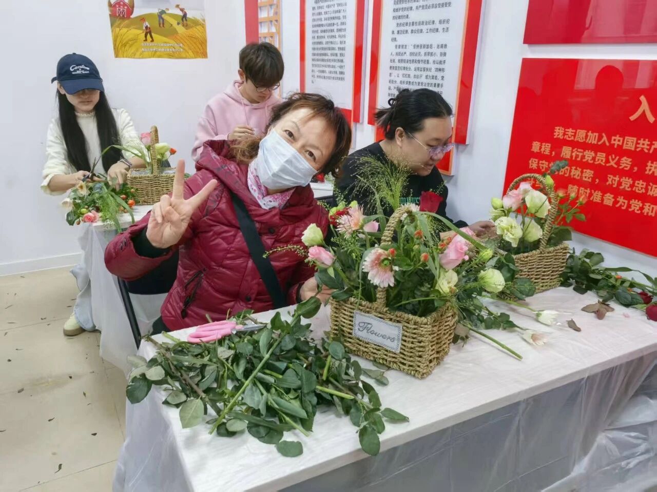 在插花环节中,党员与社区居民结对合作,共同构思花艺造型。大家边学边做,修剪花枝、搭配色彩、设计层次,在欢声笑语中完成了一篮篮独具匠心的花艺作品。活动现场花香弥漫,情意融融,老党员与青年党员亲切交流,分享生活智慧与节日故事,展现出浓浓的代际温情。插花活动结束后,同学们主动整理现场,清理花材余料,恢复活动室整洁,展现了党员良好的服务意识与责任担当。