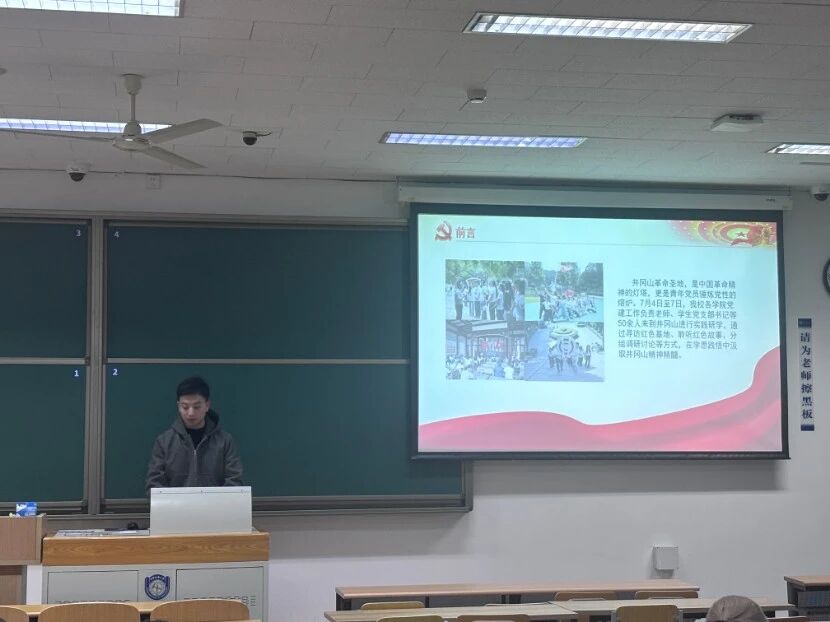 10月26日,培训班邀请我院2025年学生党务工作训练营暑期研学班学员苏艺海、赵紫薇、李钰琪、赵周博四位同志在综合楼201为培训班学员宣讲井冈山精神和研学心得。