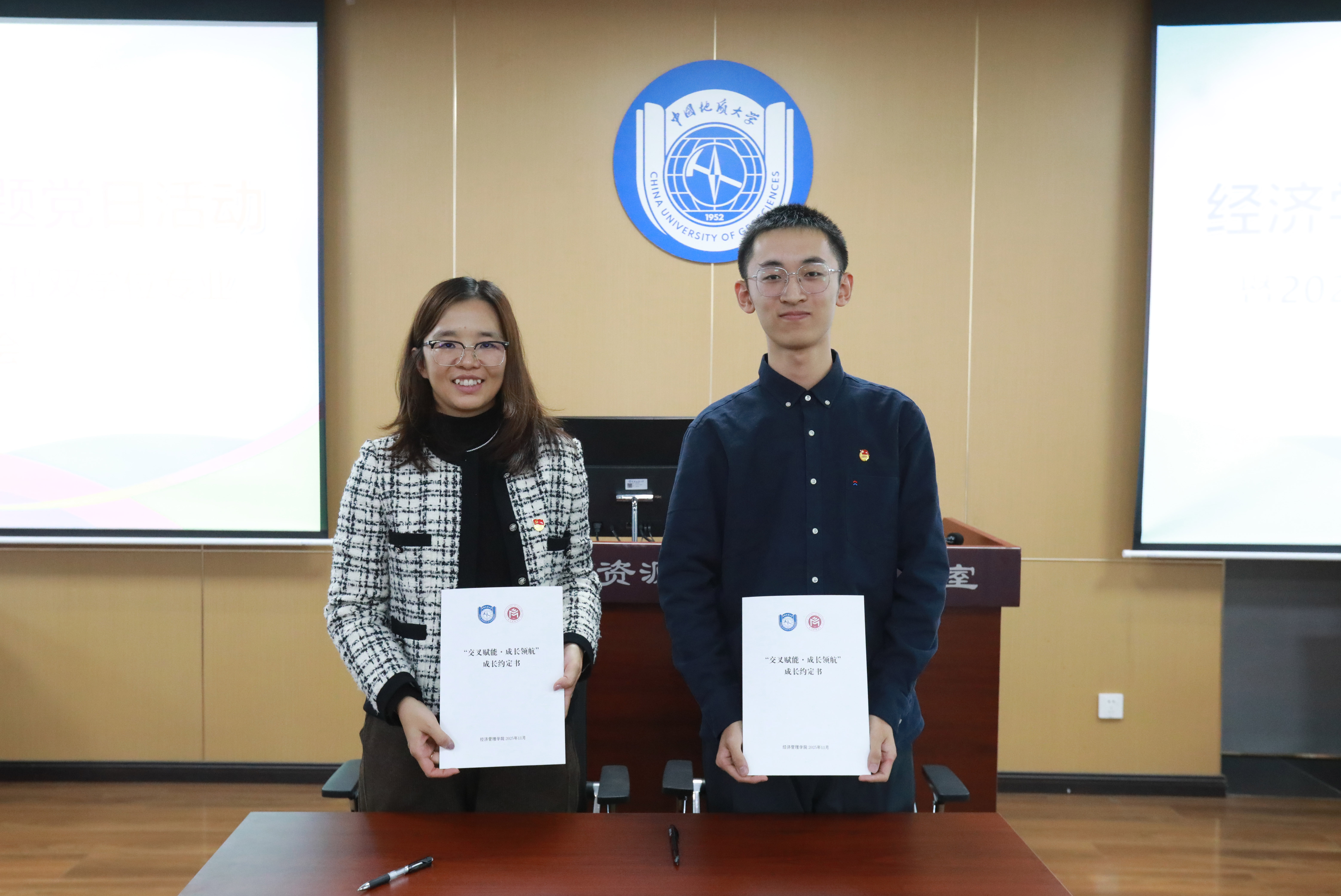 为加强党建引领,建立育人长效机制,促进师生教学相长,经济学教工党支部书记邵玲与班级班长曾子健共同签署了《“交叉赋能、成长领航”师生共建约定》,标志着党支部与班级正式建立结对共建关系。