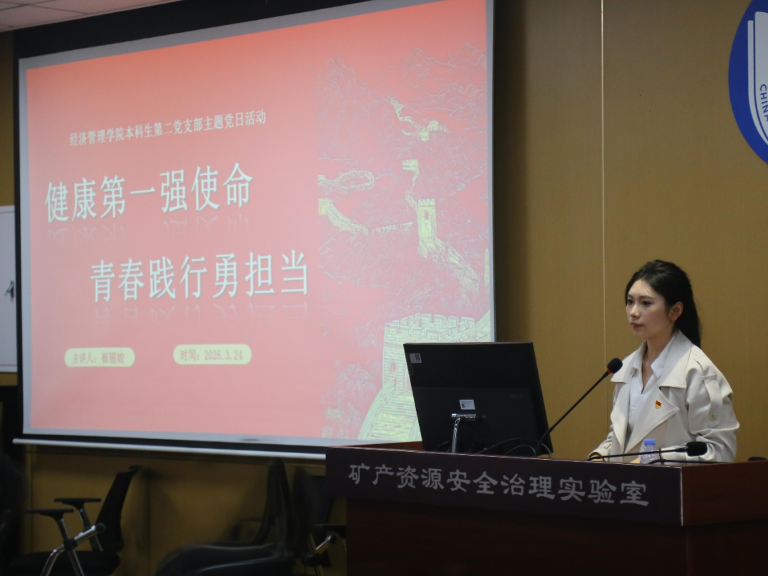 为认真学习贯彻习近平总书记在北京考察期间的重要讲话精神,切实将教育部和北京市深入落实“健康第一”工作部署会要求落到实处,3月24日下午,经济管理学院本科生第二党支部开展“健康第一强使命,青春践行勇担当”主题党日活动。中国地质大学(北京)研究生院副院长、经济管理学院副院长高湘昀受邀参会,本次活动由经济管理学院本科生第二党支部书记崔丽姣主持,支部全体党员、入党积极分子及对接班级学生代表共同参与。