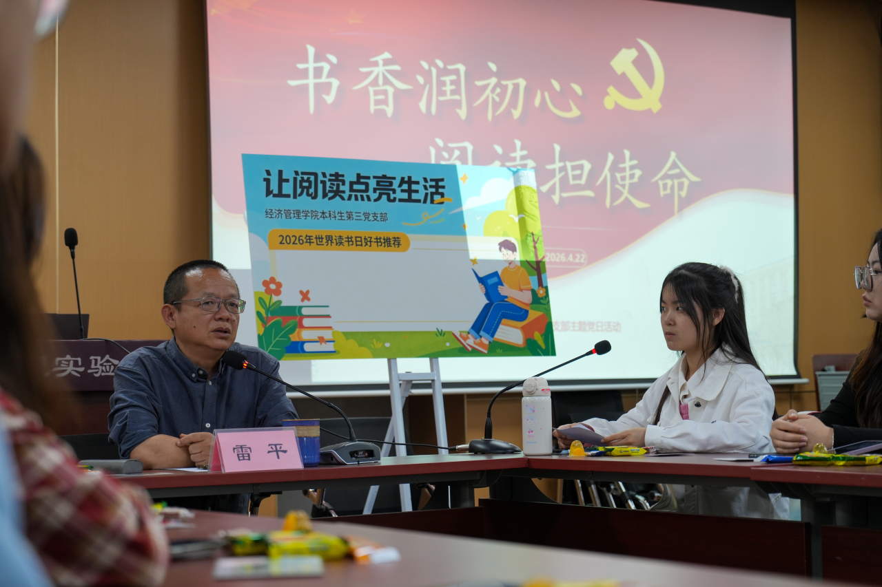 为深入学习贯彻习近平总书记关于推动全民阅读、建设书香社会的重要指示精神,引导广大党员和积极分子在阅读中坚定理想信念、涵养家国情怀,4月22日下午,经管学院本科生第三党支部在教四楼219开展“书香润初心·阅读担使命——师生共读沙龙”主题党日活动。本次活动特邀经济管理学院副院长雷平作为嘉宾出席,支部党员、入党积极分子共同参与。