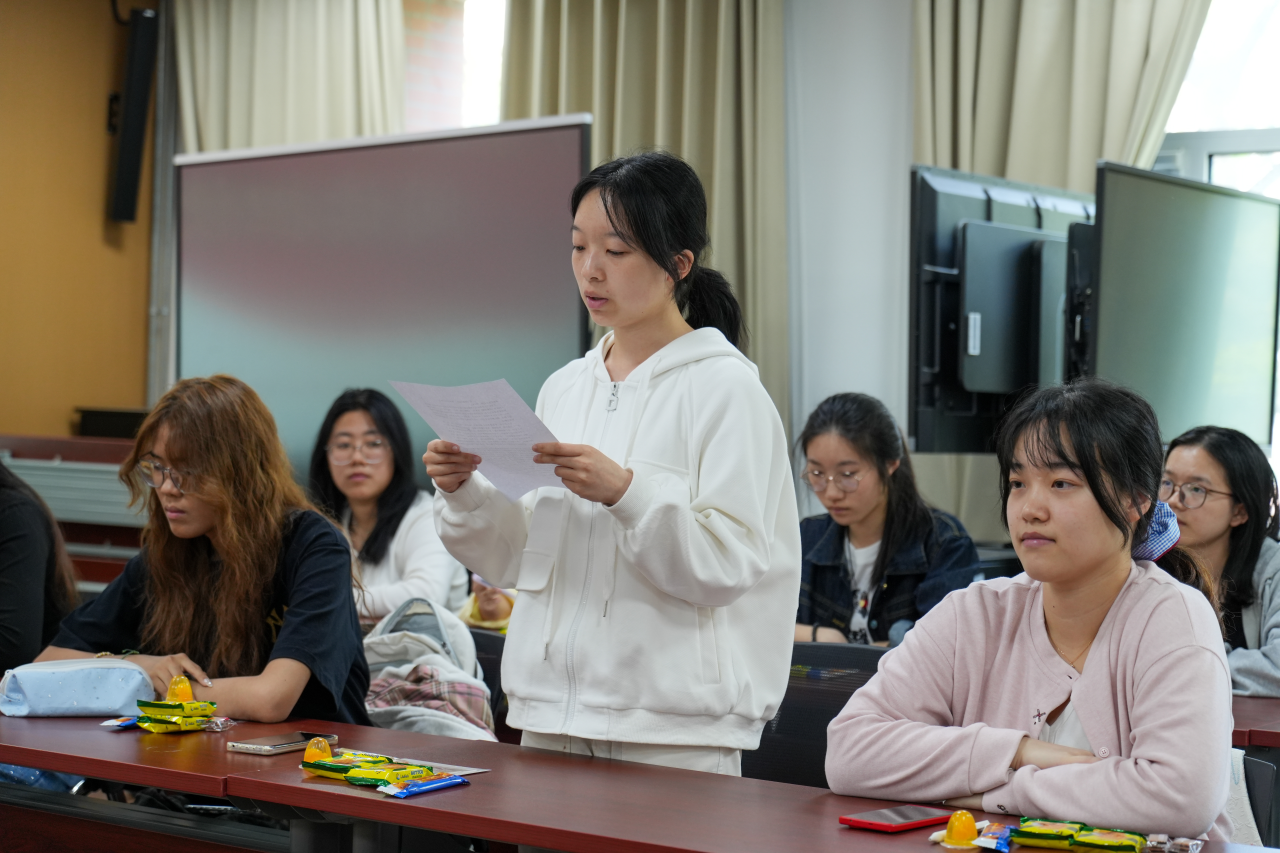 接下来进入分享环节,四位学生代表依次登台,进行每人5分钟的“闪电分享”。郑舒予同学分享了习近平总书记的《摆脱贫困》,讲述了书中蕴含的为民情怀与实干精神;张馨心同学解读刘震云的《一句顶万句》,探讨中国式人际关系中的孤独与寻找;陈兴佳同学带领大家走进赫尔曼·黑塞的《悉达多》,分享关于自我探寻与生命觉悟的哲思;李佳凝同学则通过《杀死一只知更鸟》,传递了关于正义、良知与勇气的深刻启示。四本书横跨政治、文学、哲学与法律,展现了经管学子广博的阅读视野。